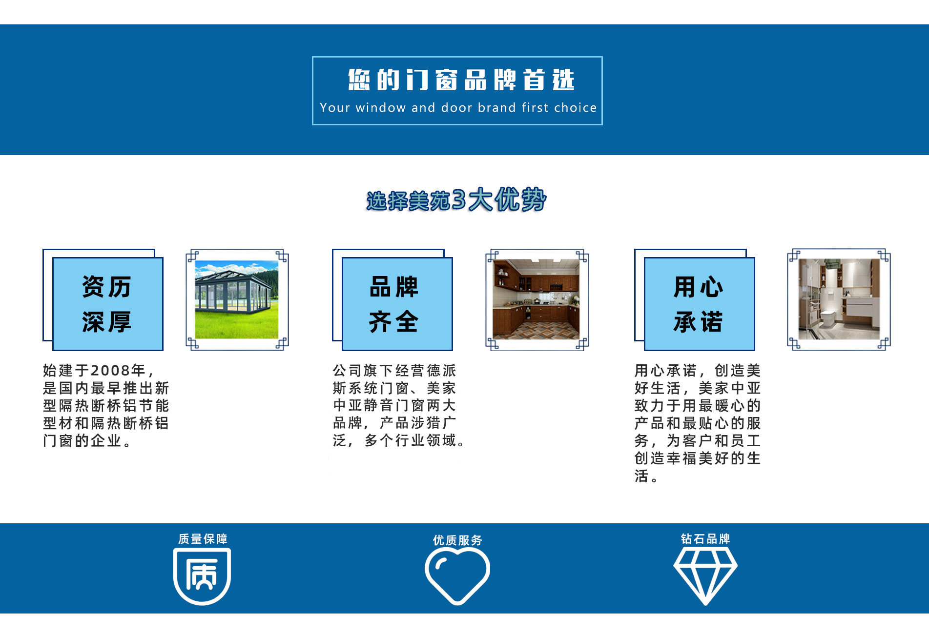 美家中亞(天津)科技有限公司前身為天津美苑斷橋鋁門窗有限公司,始建于2008年,是國內(nèi)早期推出新型隔熱斷橋鋁節(jié)能型材和隔熱斷橋鋁門窗的企業(yè)。公司旗下經(jīng)營德派斯系統(tǒng)門窗、美家中亞靜音門窗兩個品牌,產(chǎn)品涉及斷橋鋁門窗、系統(tǒng)門窗、無縫焊接門窗、門窗建筑工程、智能家居、定制全鋁家裝設(shè)計等多個行業(yè)領(lǐng)域。用心承諾,創(chuàng)造美好生活,美家中亞致力于用暖心的產(chǎn)品和貼心的服務(wù),為客戶和員工創(chuàng)造幸福美好的生活。美家中亞,以客戶體驗為使命,以產(chǎn)品品質(zhì)為根本,在低碳、環(huán)保、科技創(chuàng)新下,將好門窗帶入千家萬戶!